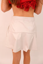 Bring elevated edge to your gameday look with this cream faux leather wrap skort. The sleek faux leather finish instantly dresses up any outfit, while the wrap-front overlay keeps it flirty and feminine. Built-in shorts ensure all-day comfort and coverage, so you can cheer, mingle, and celebrate without a second thought. The neutral cream hue pairs effortlessly with bold team colors, metallic accessories, or chic neutrals for a more understated vibe.