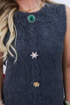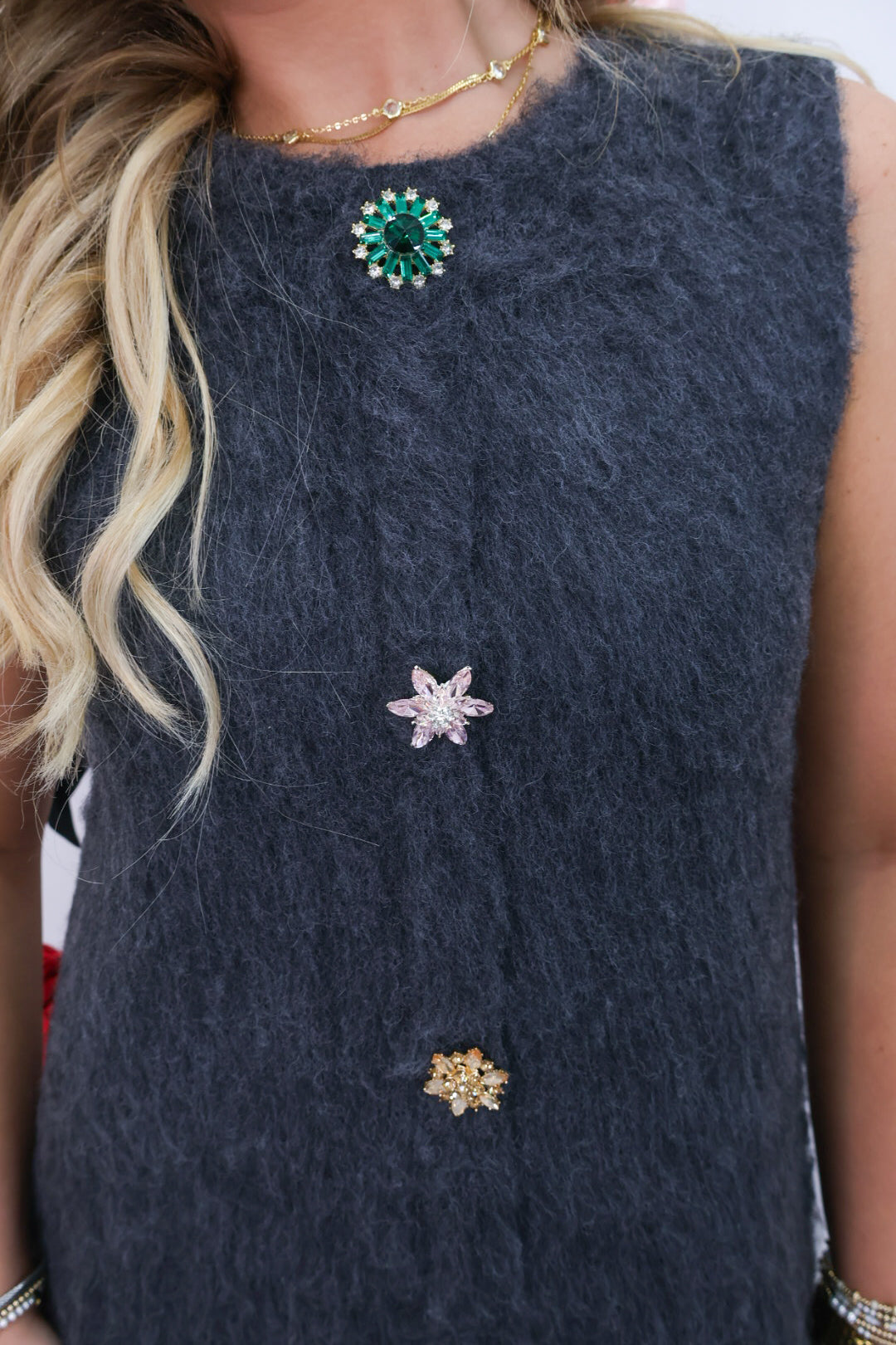 Bring a little sparkle to sweater-weather season! The Charcoal Jewel Button Fuzzy Dress is a mix of cozy and glam, featuring a soft textured knit and statement jewel buttons down the front. The straight shift silhouette gives it that classic, vintage-inspired charm — easy to dress up with heels or wear casually with tights and boots. It’s festive, fun, and totally wearable beyond the holidays.