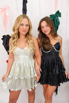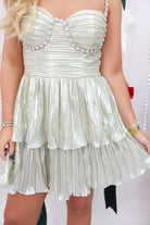 Make an entrance in our Pearl Strap Metallic Mini Dress — a total showstopper that’s equal parts playful and elegant! With pleated metallic fabric that catches every light and pearl-embellished straps for that luxe touch, this dress is your go-to for holiday parties and New Year’s Eve celebrations. The tiered ruffle skirt adds movement and volume, while the structured bust gives it a flattering, feminine shape.