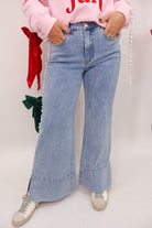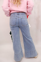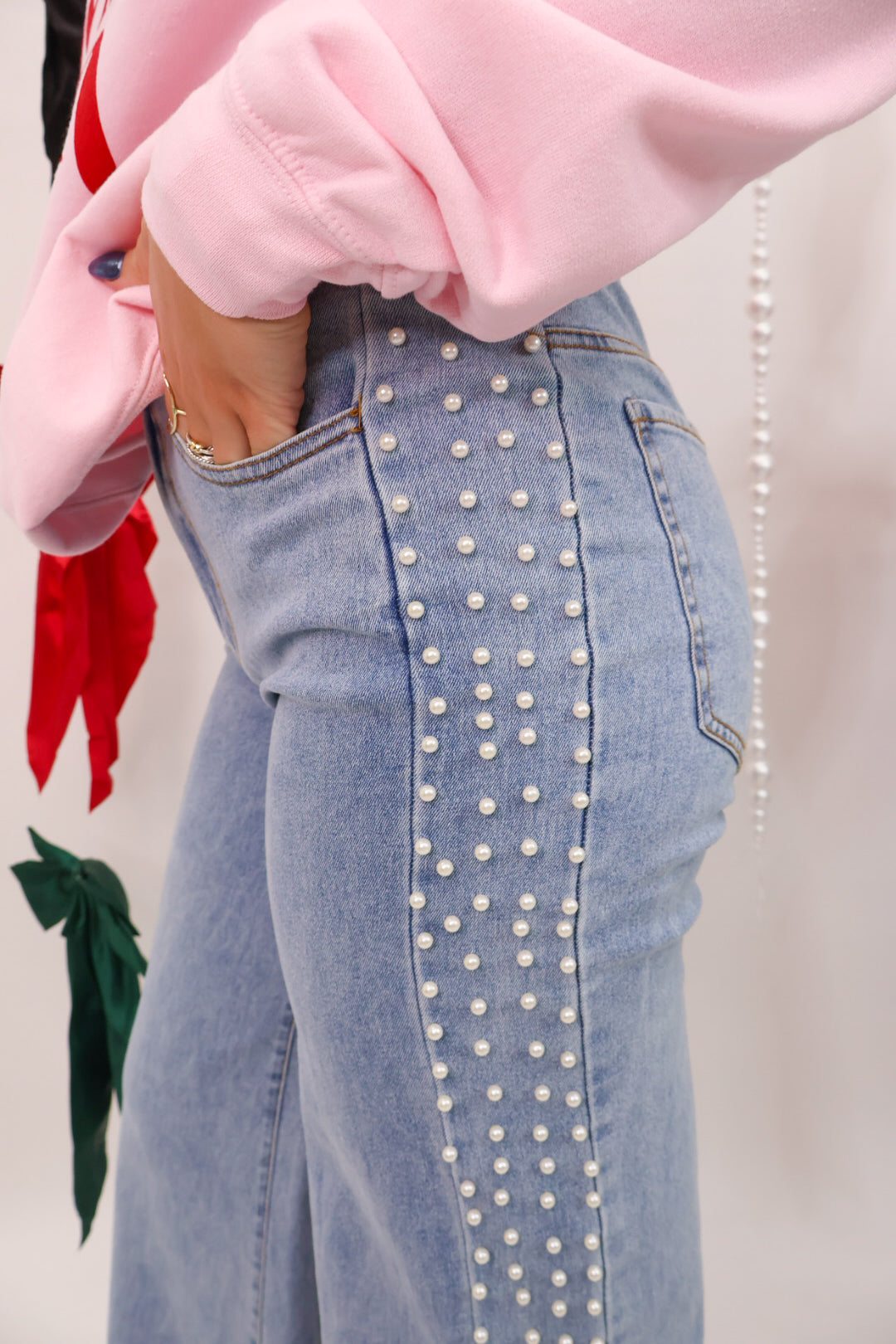 Meet the jeans that steal the spotlight — our Pearl Embellished Denim is a must for anyone who loves a touch of glam with their casual. These light wash wide-leg jeans feature pearl detailing down the sides and subtle front slits at the hem, giving you that perfect mix of modern edge and feminine charm. A flattering high rise and soft denim fabric make them comfortable enough for everyday wear but polished enough for holiday outings.