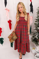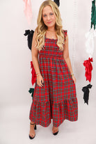 plaid maxi dress, Christmas plaid dress, holiday dress with pockets, smocked holiday dress, red plaid midi dress, festive dress outfit, christmas family photo dress