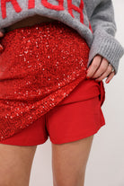 Bring the sparkle — this bright red sequin mini skirt is made for holiday parties, Christmas photos, and every “let’s be extra” moment in between! It’s lined with comfy shorts underneath so you can dance, sit, and celebrate without worrying about a thing. Bold, festive, and impossible to miss — this one’s a showstopper.