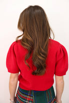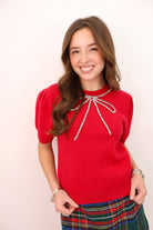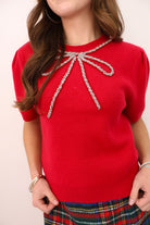 Short Sleeve Beaded Bow Sweater - Red