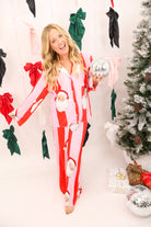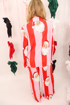 Santa-approved and extra sweet — our Santa Stripe Pajama Set is the ultimate Christmas Eve outfit! With its fun red and pink candy stripe pattern and vintage-style Santa print, this set is giving holiday nostalgia meets girly charm. Designed with a relaxed, generous fit, button-front top, and elastic waistband with tie detail, it’s comfy enough for sleeping in yet cute enough for matching photos under the tree.