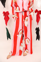 Christmas pajamas, holiday pajama set, Santa print pajamas, red and pink stripe pajamas, festive loungewear, women’s holiday sleepwear, cozy Christmas outfit, matching family pajamas, women's fun Christmas pajamas, women's cute Christmas pajamas