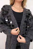 charcoal sequin cardigan, holiday outfit idea, women’s fuzzy cardigan, sequin party outfit, boutique winter sweaters, Christmas party outfit, New Year’s Eve outfit, women’s statement cardigan