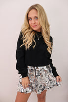 Keep the top simple — a fitted black sweater or bodysuit is perfect to let the skirt shine. Pair it with a fitted printed top for an extra fun look!