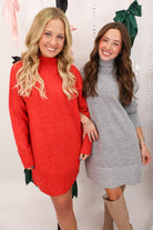 sweater dress, knit sweater dress, cozy fall outfit, casual winter dress, red sweater dress, gray sweater dress, women’s fall outfit, holiday casual look, oversized sweater dress