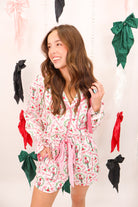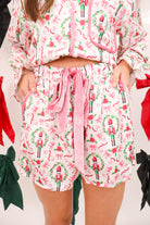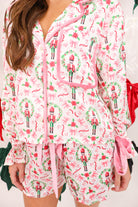 Cue the sugar plum dreams! ✨ The Nutcracker Satin Pajama Set is a festive favorite made for cozy Christmas mornings and nights spent wrapping gifts under the tree. This silky set features a charming holiday print complete with nutcrackers, wreaths, bows, and candy canes — all trimmed in pink piping for the sweetest seasonal touch. The button-down top pairs perfectly with the matching shorts, complete with an elastic waistband and a soft pink velvet tie that gives this look a luxe, feminine finish.