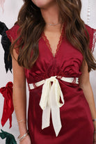 satin bow dress, holiday maxi dress, Christmas dress, winter formal dress, elegant holiday outfit, satin lace dress, burgundy holiday midi dress