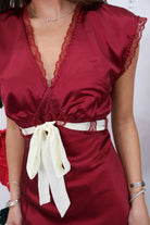 Romantic, timeless, and just the right amount of festive — the Wine Satin Bow Midi Dress is made for every special moment this season. Designed in a deep wine satin fabric with delicate lace trim and a contrasting ivory bow at the waist, this dress creates a flattering, feminine shape that feels both elegant and comfortable. The soft drape and subtle sheen make it perfect for Christmas parties, photos, or even winter weddings!
