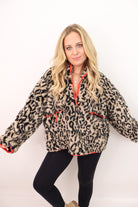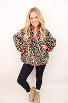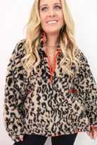 leopard quarter zip pullover, sherpa leopard jacket, boutique winter pullover, cozy leopard top, women’s fuzzy half zip, contrast trim leopard jacket, warm winter tops for women, cute cold weather outfits, boutique outerwear, trendy animal print pullover