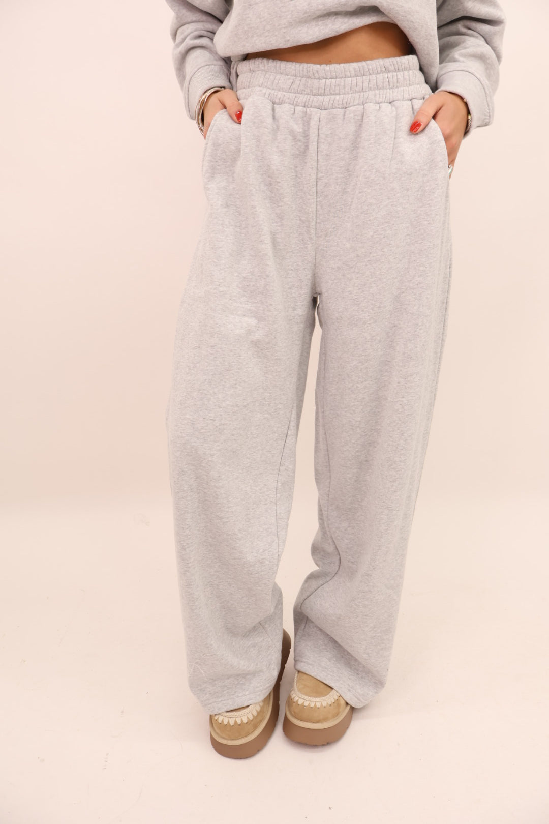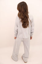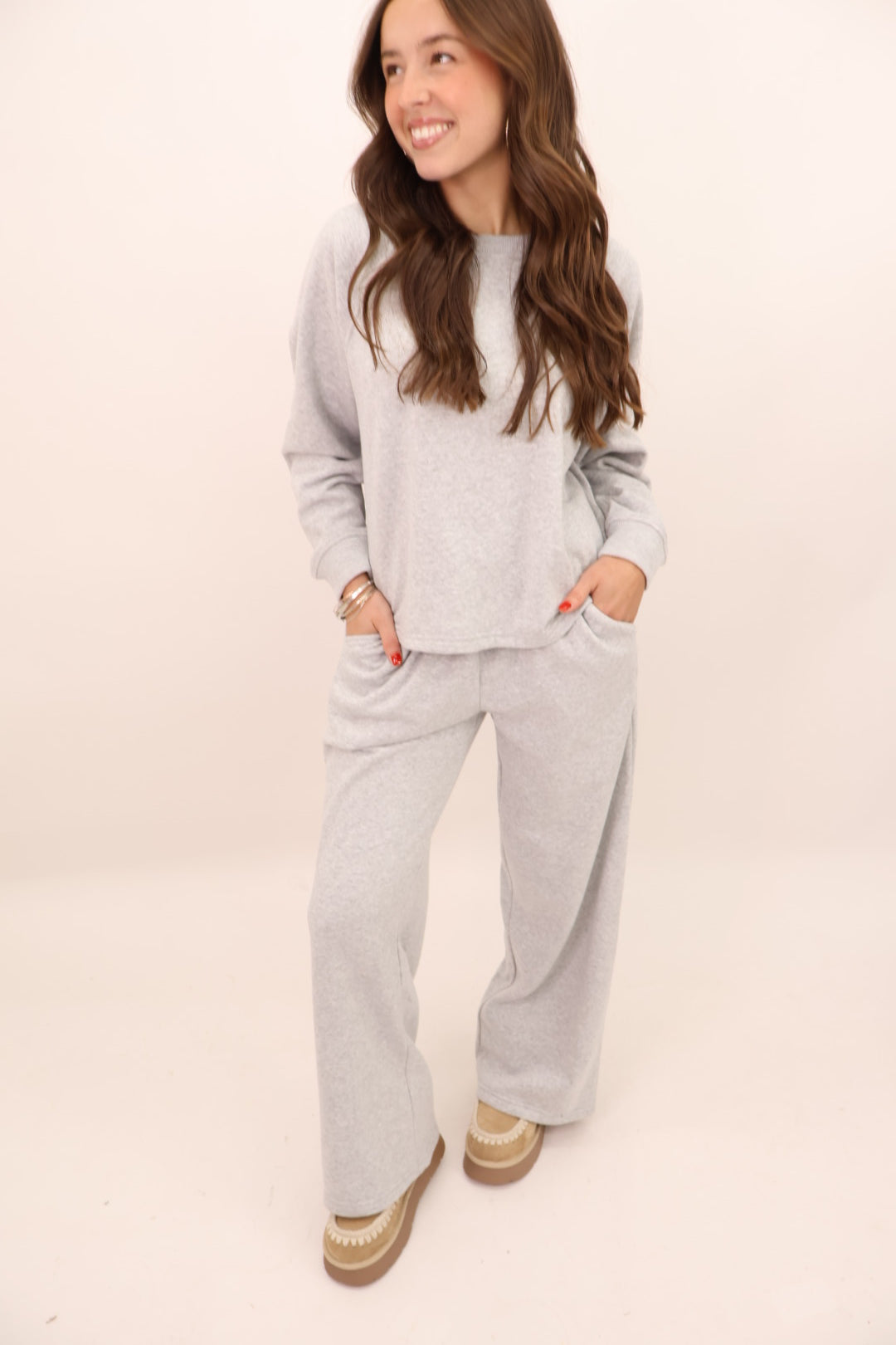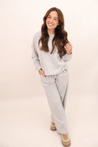 Your new everyday uniform is here — soft, warm, and effortlessly cute. This lounge set features a relaxed crewneck top and full-length pants designed with an elastic waistband and pockets. The fabric drapes beautifully without feeling heavy, making it perfect for school drop-off, work-from-home days, travel days, or just being comfy around the house.