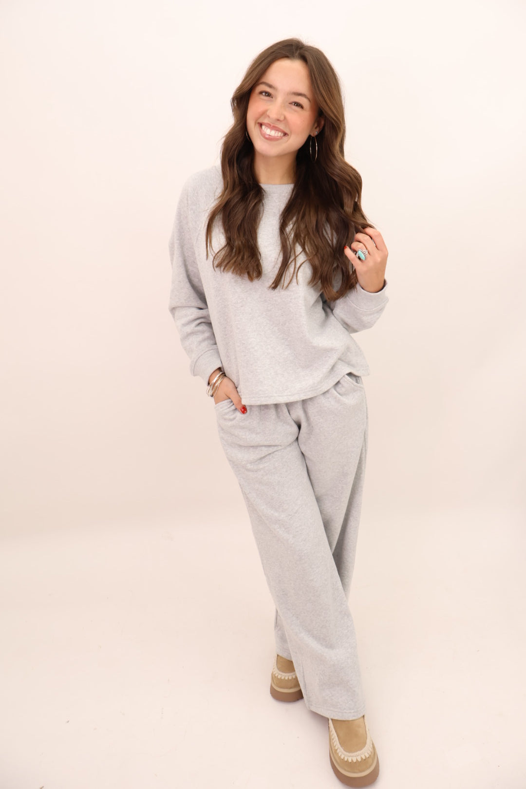 The matching top-and-bottom moment feels elevated but easy, and the fit is spot-on: relaxed but not sloppy, cozy but still polished. You can French tuck the top, leave it out, or layer it with denim or a puffer vest. This is one of those sets you’ll reach for again and again because it always makes you feel put together with zero effort!