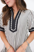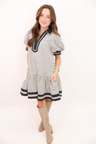 Meet your new fall favorite — the Black Striped Dress. This effortlessly chic dress features a cream and black stripe pattern with bold contrast trim for a modern twist on a classic. The structured puff sleeves and tiered silhouette give it that feminine flair we love, while the easy pull-on fit keeps it comfortable for all-day wear. It’s one of those pieces that feels polished but playful — perfect for brunch, dinner, or your next fall event.