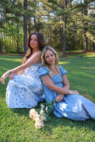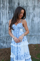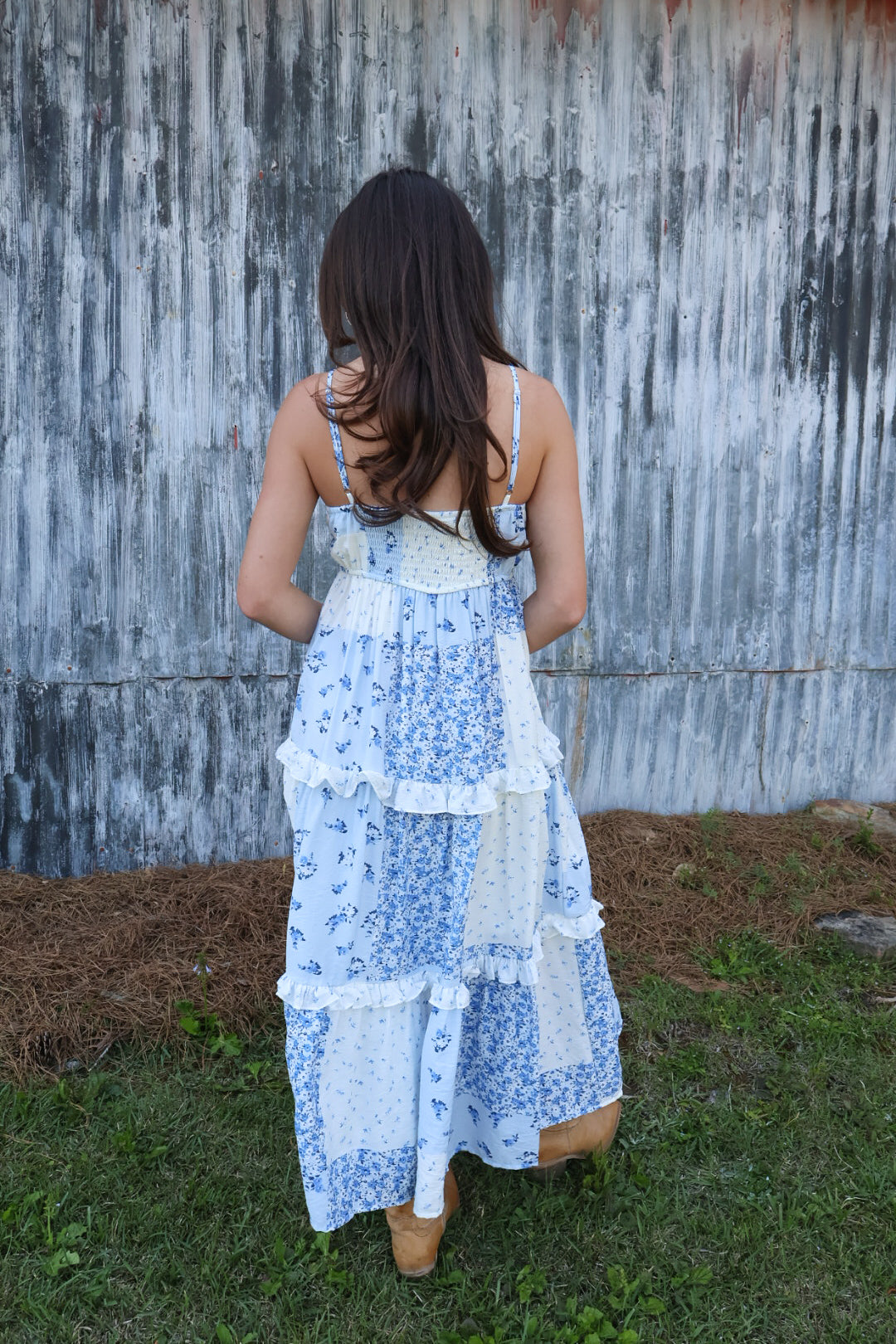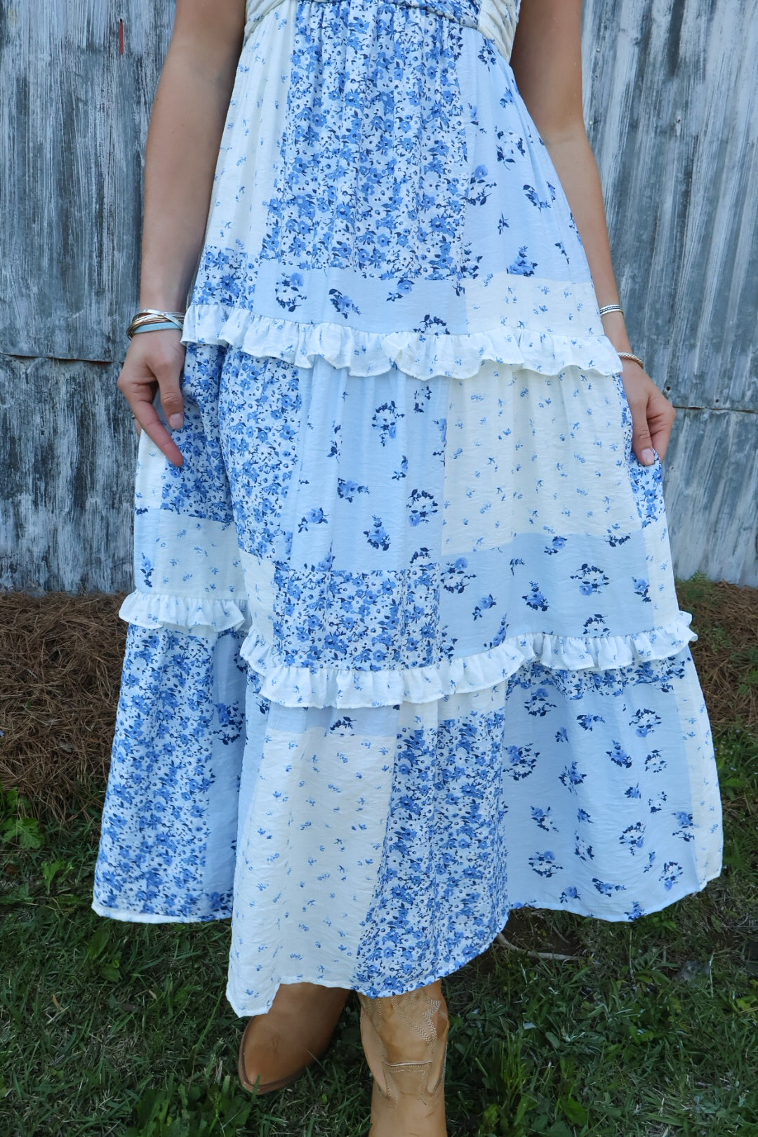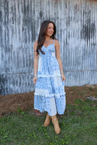 blue floral midi dress, patchwork midi dress, summer maxi dress, feminine midi dress, country concert dress, flowy midi dress, boutique maxi dress, romantic summer outfit