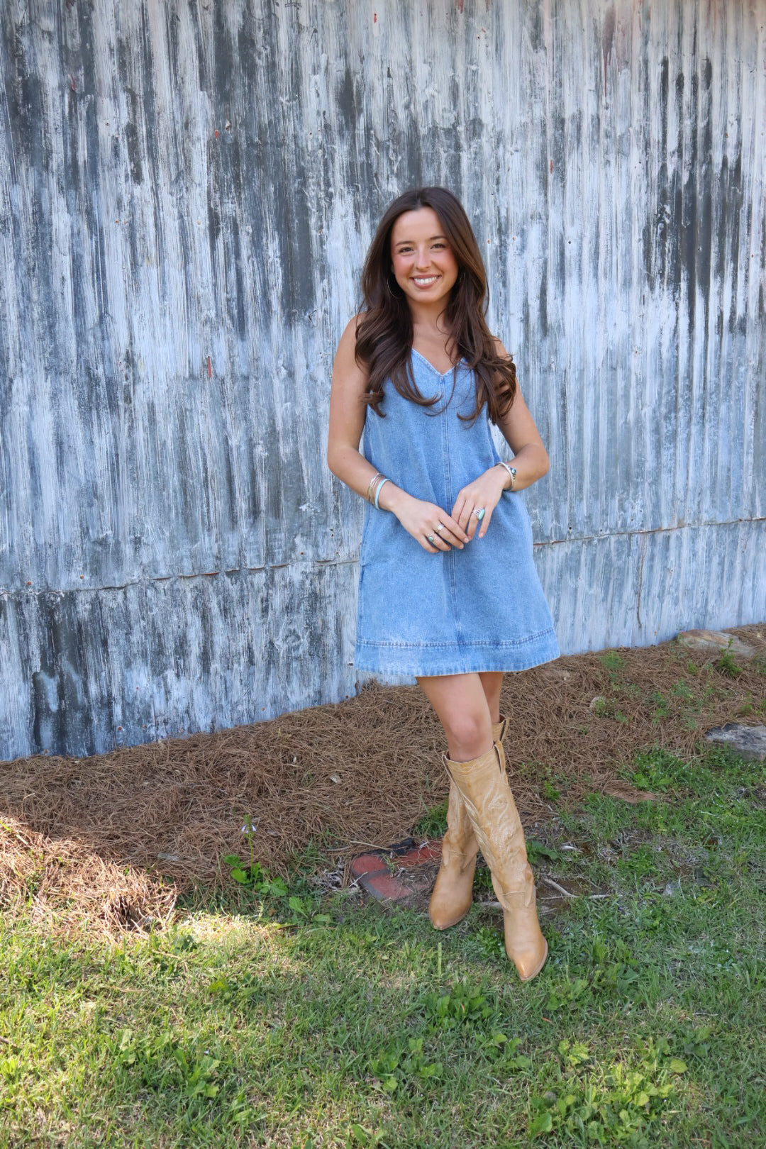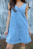 denim mini dress, casual denim dress, swing denim dress, country concert outfit, sleeveless denim dress, everyday denim outfit, boutique denim dress, summer casual dress