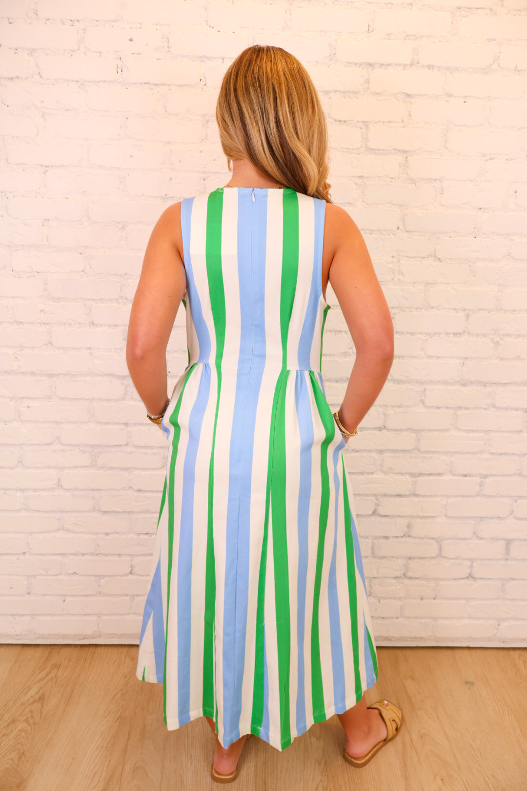 The fitted bodice creates a clean, tailored look through the top, while the gathered midi skirt gives you that easy, flowy silhouette we all love. The vertical stripe pattern elongates the body and adds that fun pop of color that instantly makes you feel put together — even on busy days.