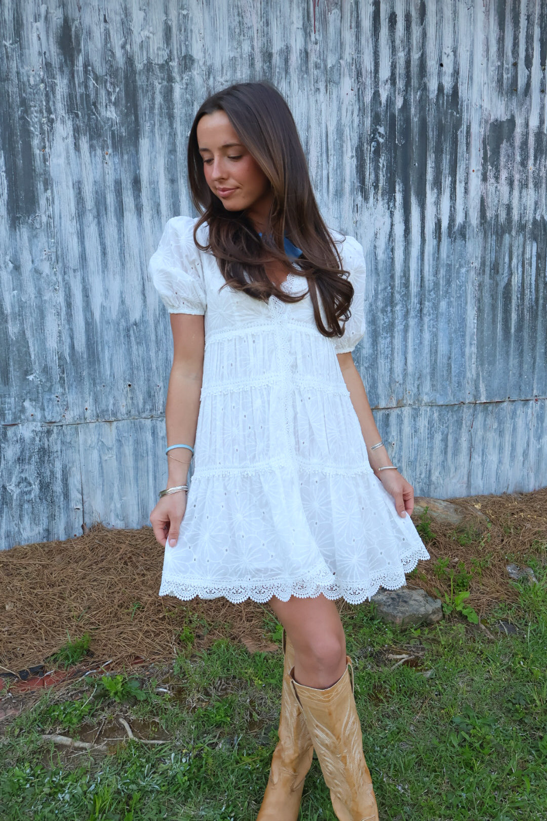 This is one of those dresses that just feels like summer. The eyelet detailing, soft tiered shape, and puff sleeves make it feminine and flattering without being over the top. It’s light, airy, and so easy to wear.