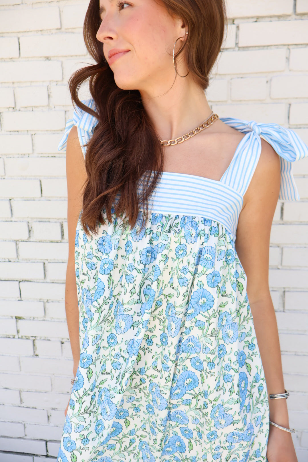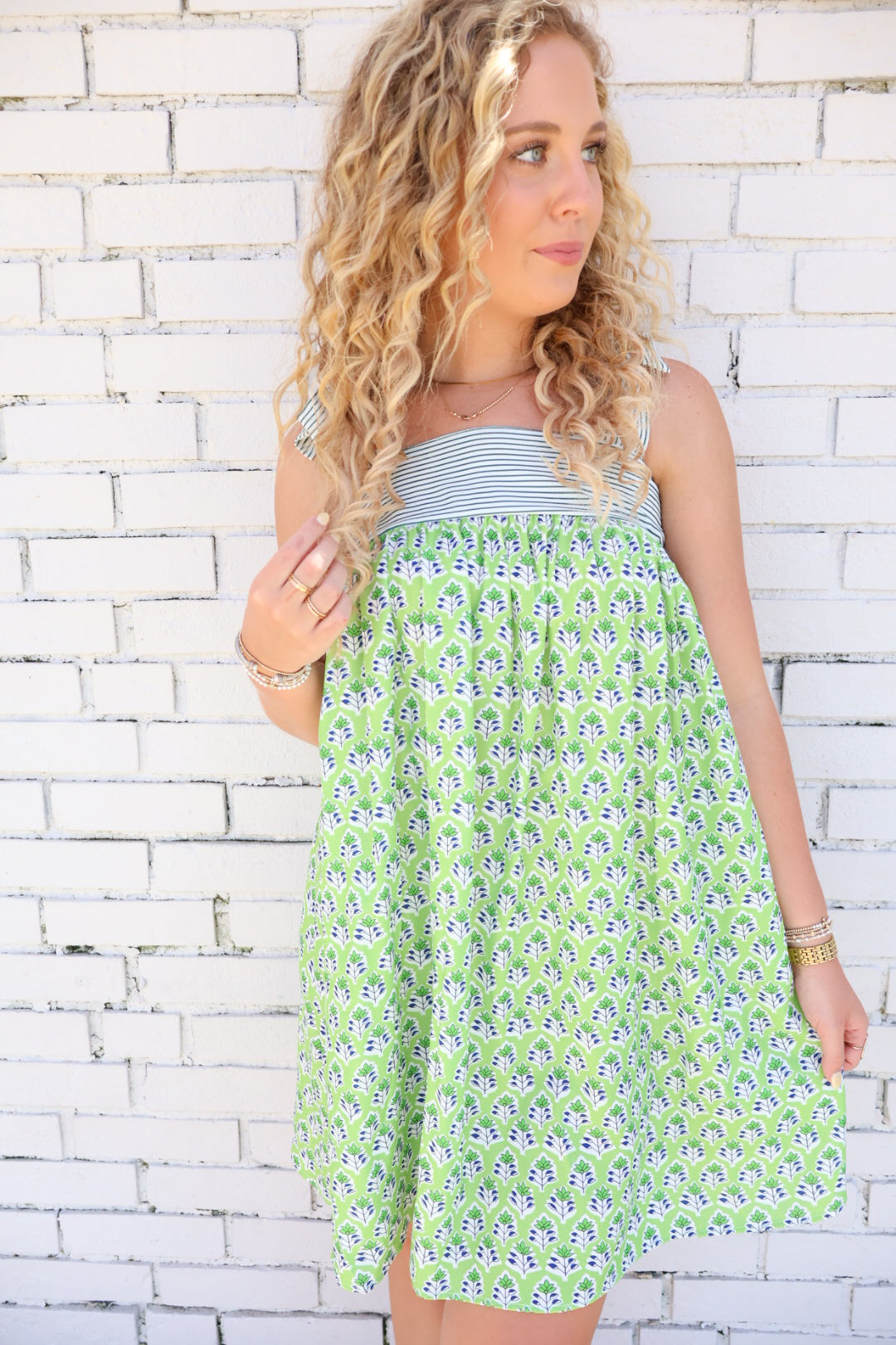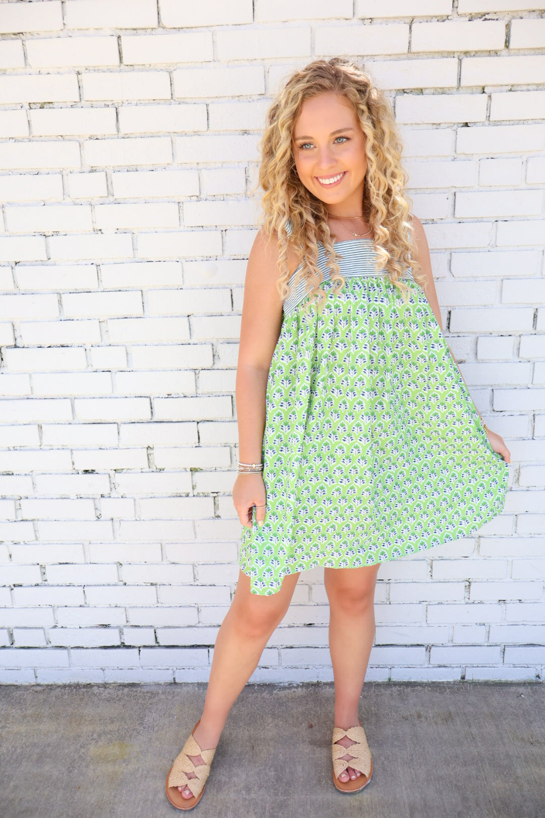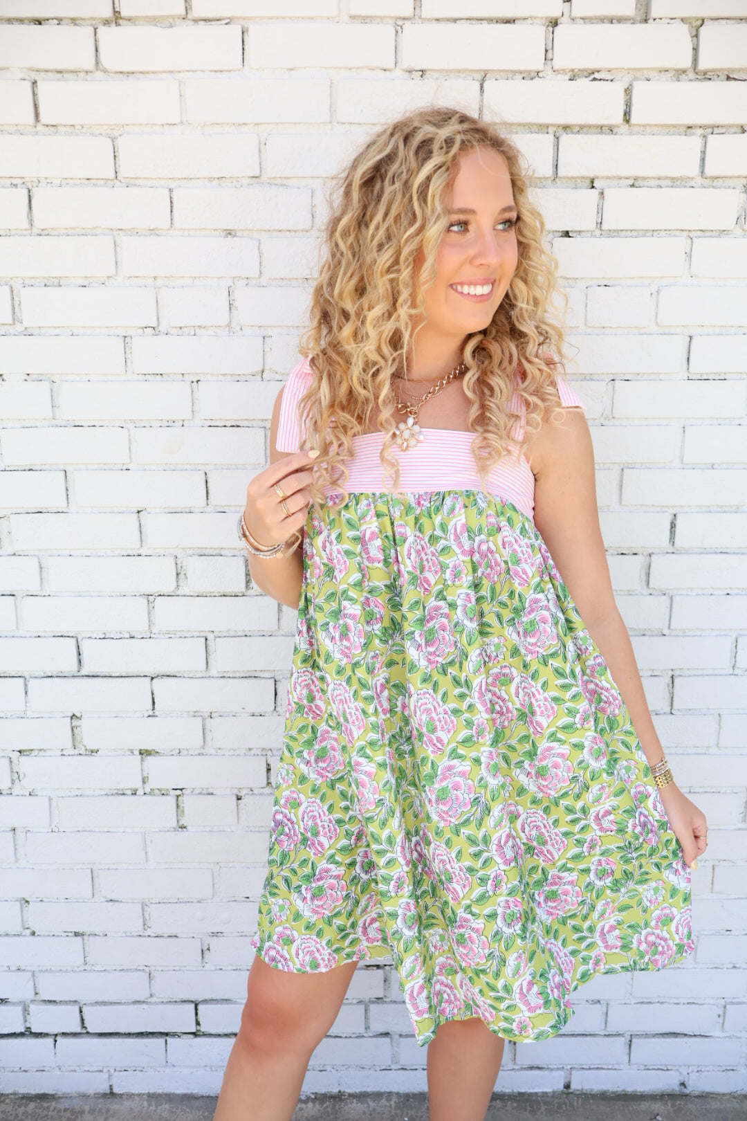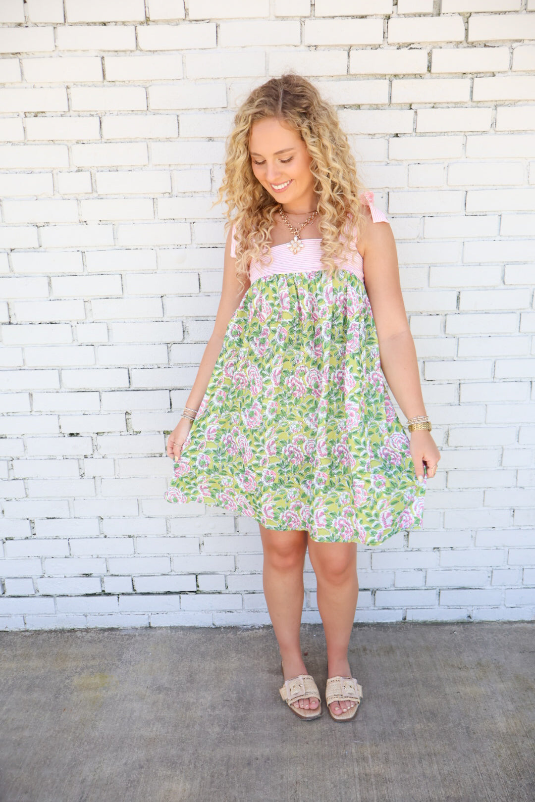 Green & Pink Floral Stripe Shoulder Tie Dress