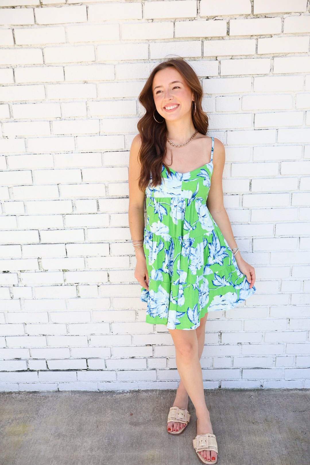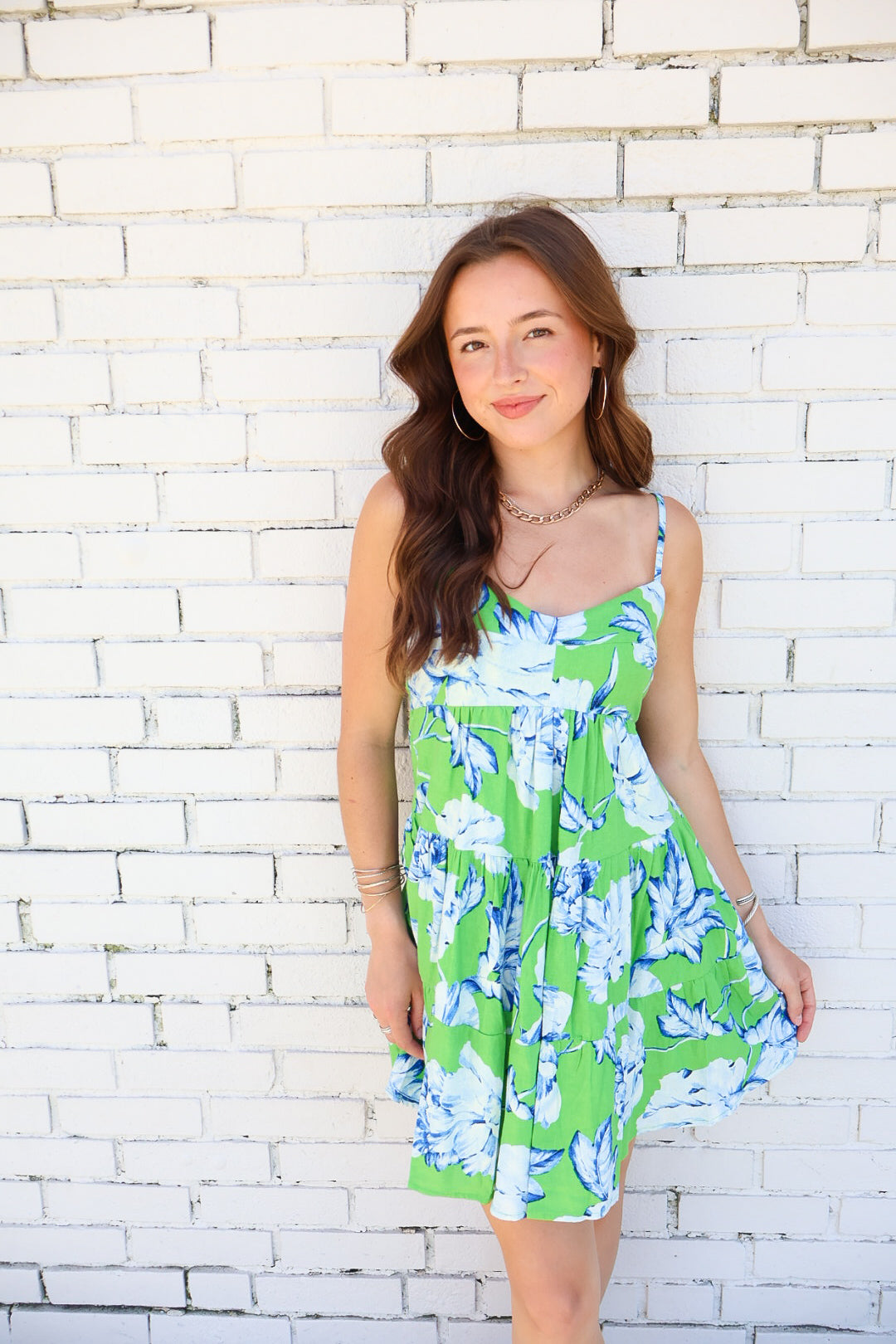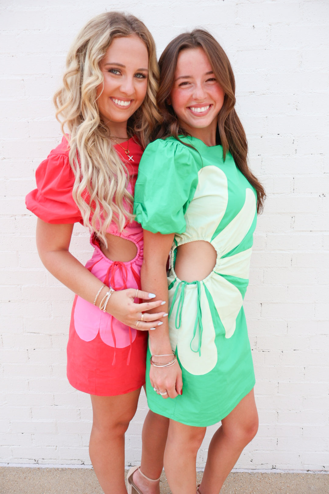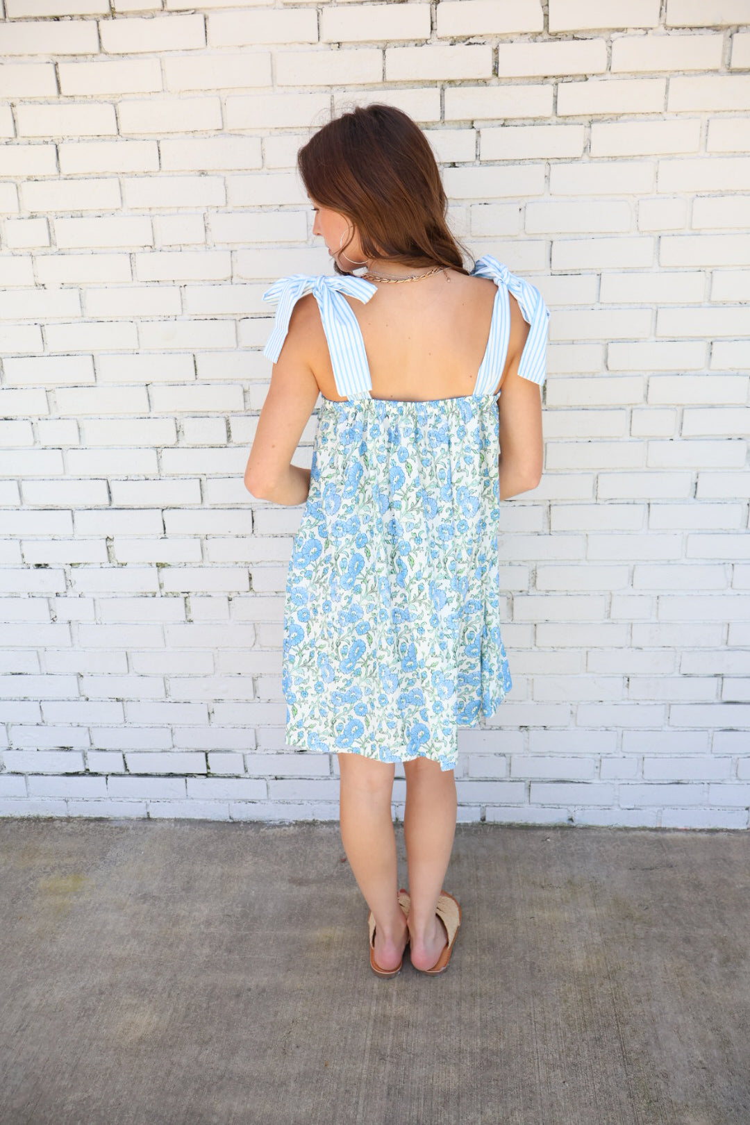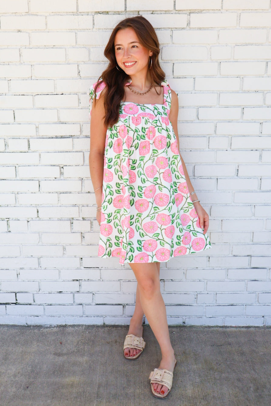 Green & Pink Floral Stripe Shoulder Tie Dress