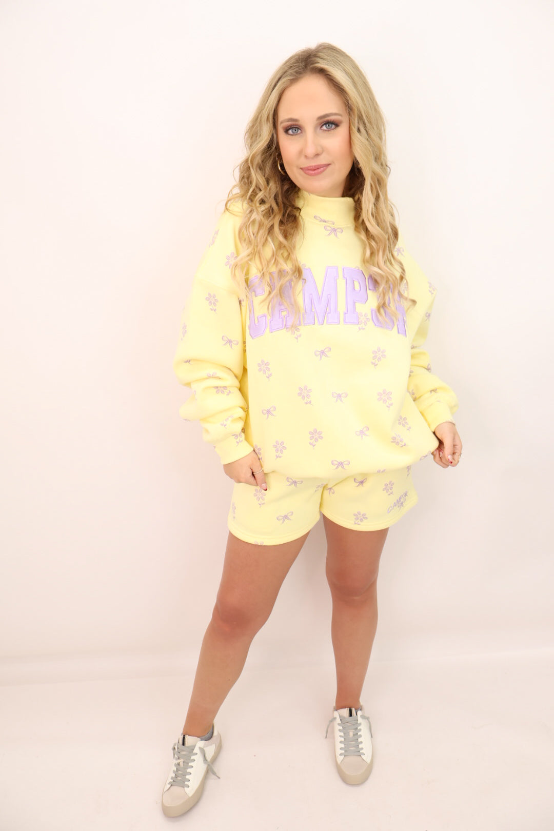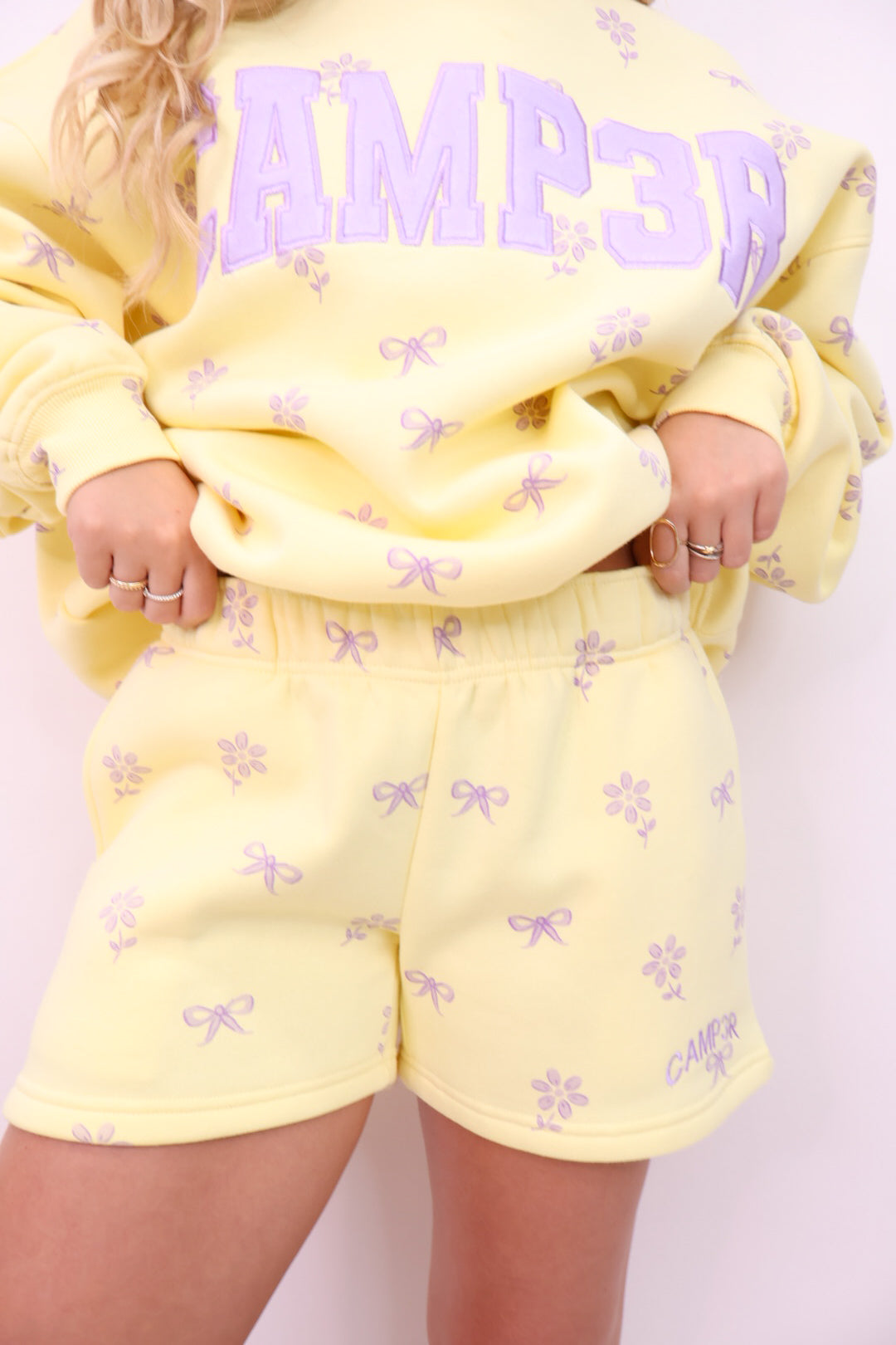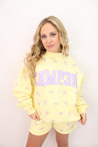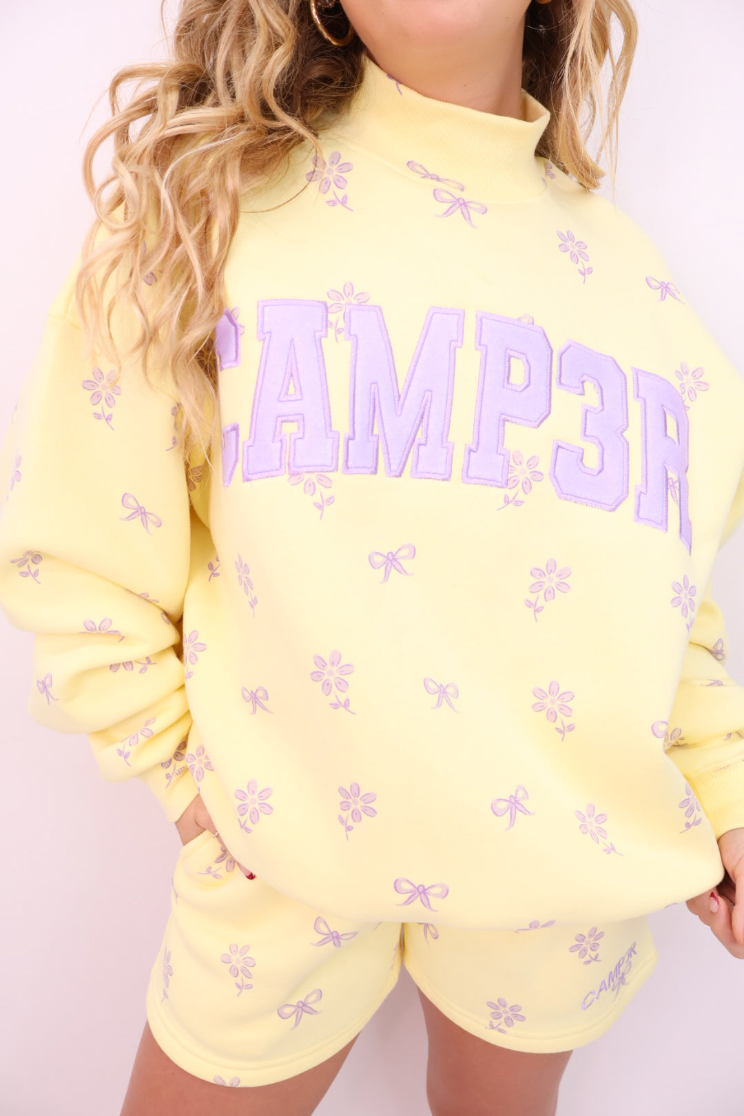 The pullover has a relaxed, easy fit with ribbed cuffs and hem, finished with the bold “CAMP3R” lettering across the front for that signature sporty-cute look. The soft yellow base is sprinkled with the sweetest lavender floral details, giving it a fresh, feminine feel that’s perfect for spring and summer lounging.