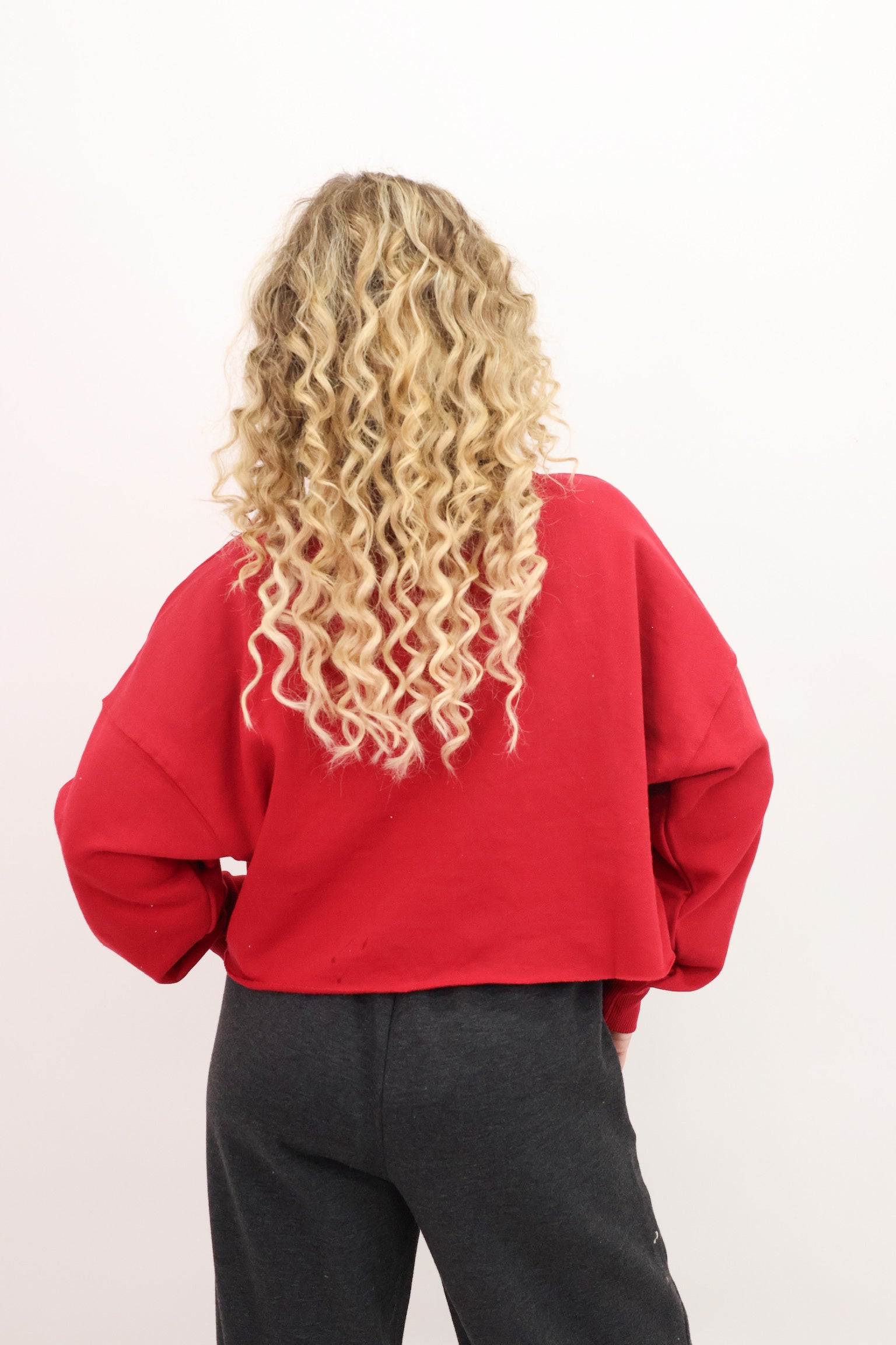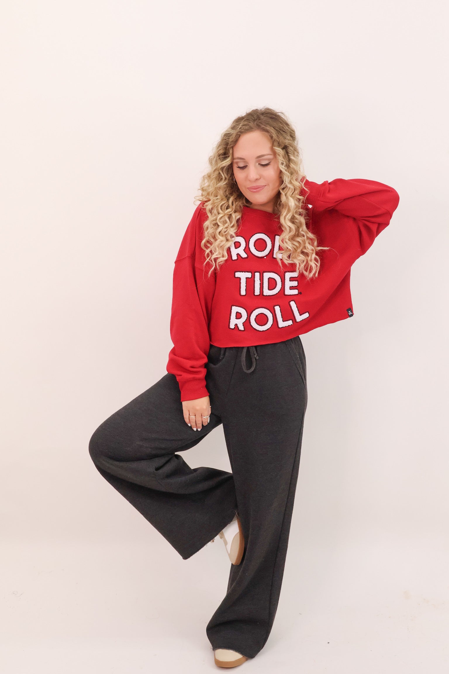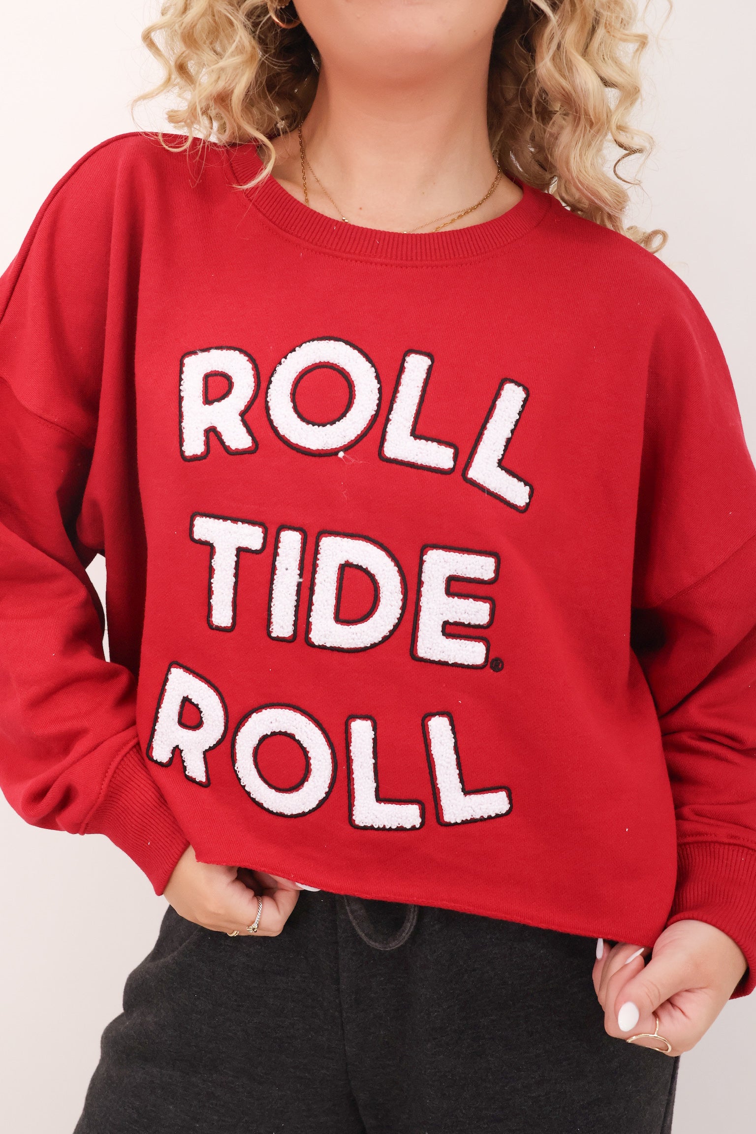 Cheer on your team in cozy style with this cropped chenille “Roll Tide Roll” sweatshirt. Made in a bold crimson red, it’s soft and lightweight with just the right amount of slouch for layering. The fuzzy chenille lettering gives it a standout look while keeping things classic. A true gameday essential that you’ll wear all season long!
