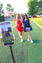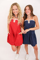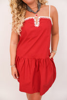 Our Poplin Drop Waist Mini Dress is a flirty and flattering option that effortlessly blends girly charm with sporty energy. Featuring a bold crimson body, playful flounce hem skirt, and white whipstitch trim around the notched neckline, this mini is made for standing out—whether you’re tailgating, stadium-hopping, or just grabbing drinks with the crew. The structured cotton-blend fabric gives it shape while staying lightweight and breathable, and the adjustable straps and back zip make it an easy, comfortable fit.
