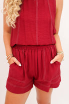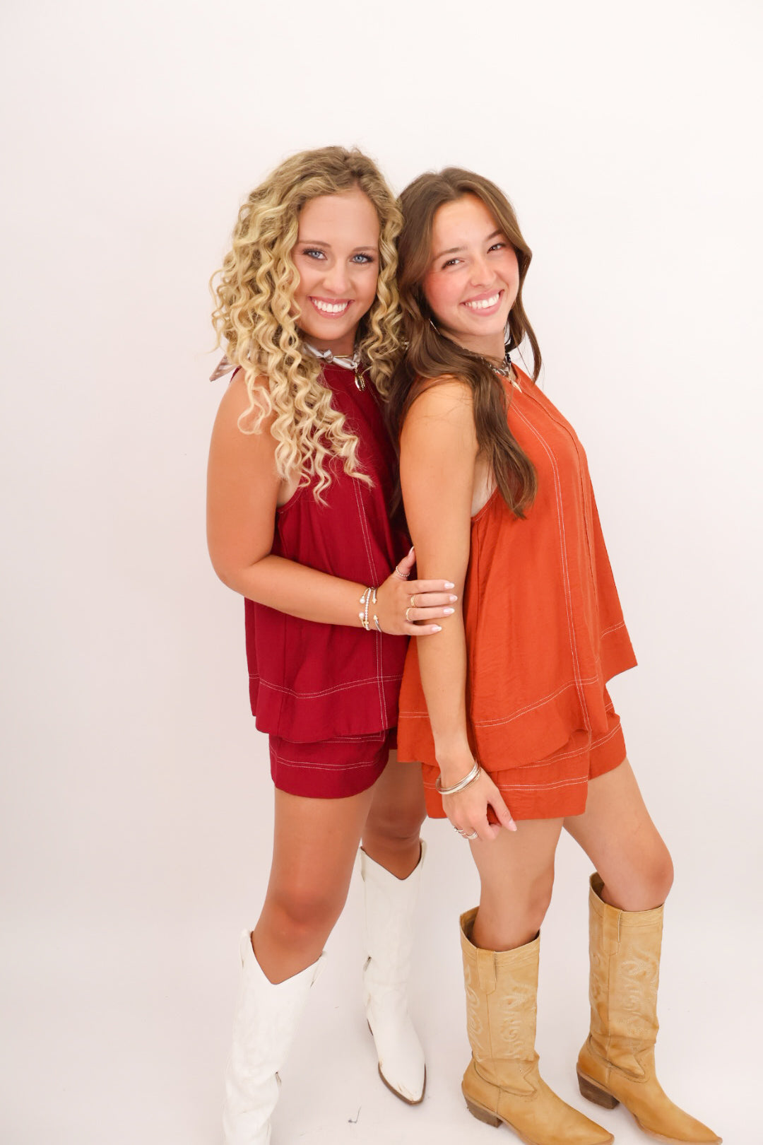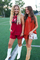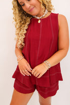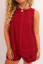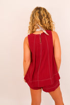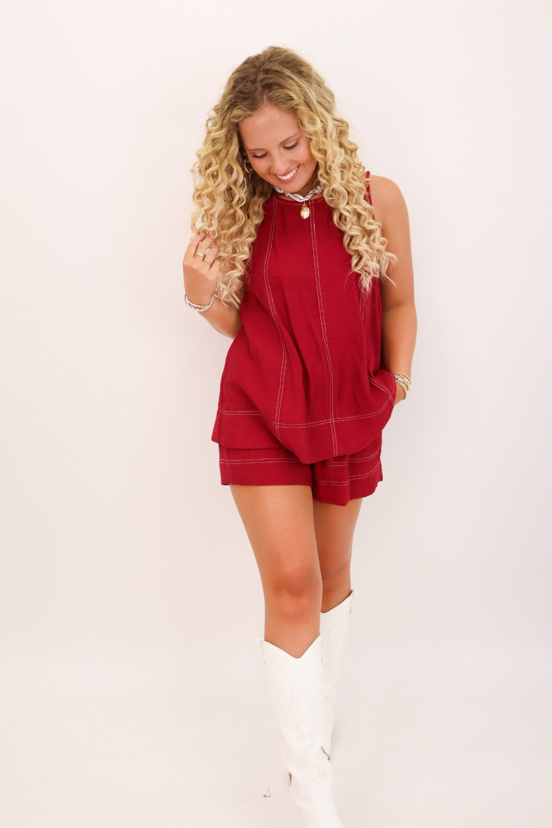 Laid-back, sporty, and effortlessly cool—this crimson two-piece set is here to make gameday styling a breeze! The sleeveless swing tank and matching high-rise shorts are made from a breathable, lightweight athletic-style fabric with visible topstitch detailing that adds a touch of edge to the clean silhouette. It’s flowy, comfy, and totally functional (yes, the shorts have pockets!).
