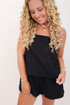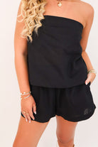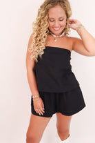 black linen strapless set, casual black shorts set, neutral gameday outfit, black two-piece outfit, lightweight linen-blend set, trendy gameday look, gameday outfit inspo