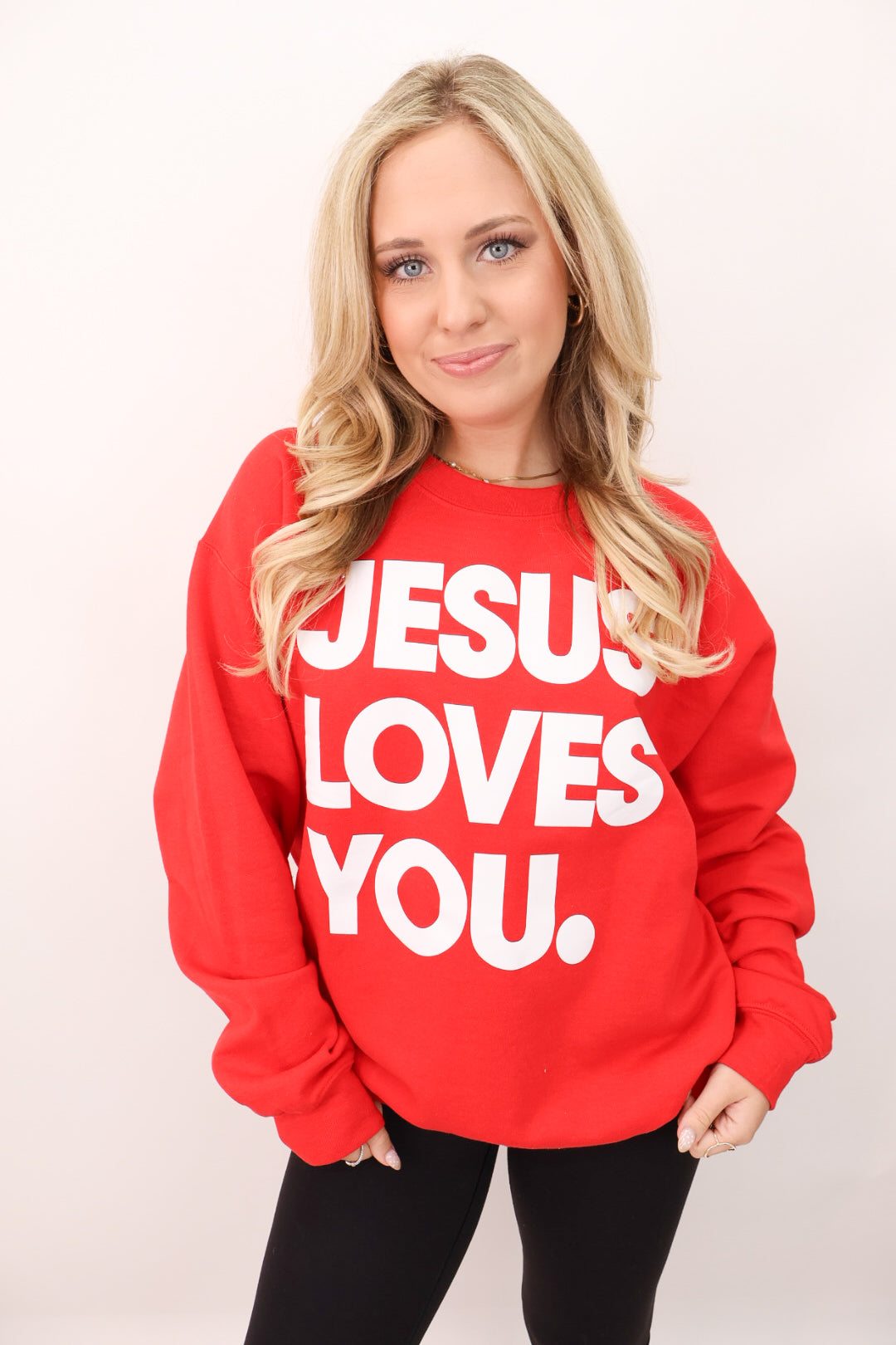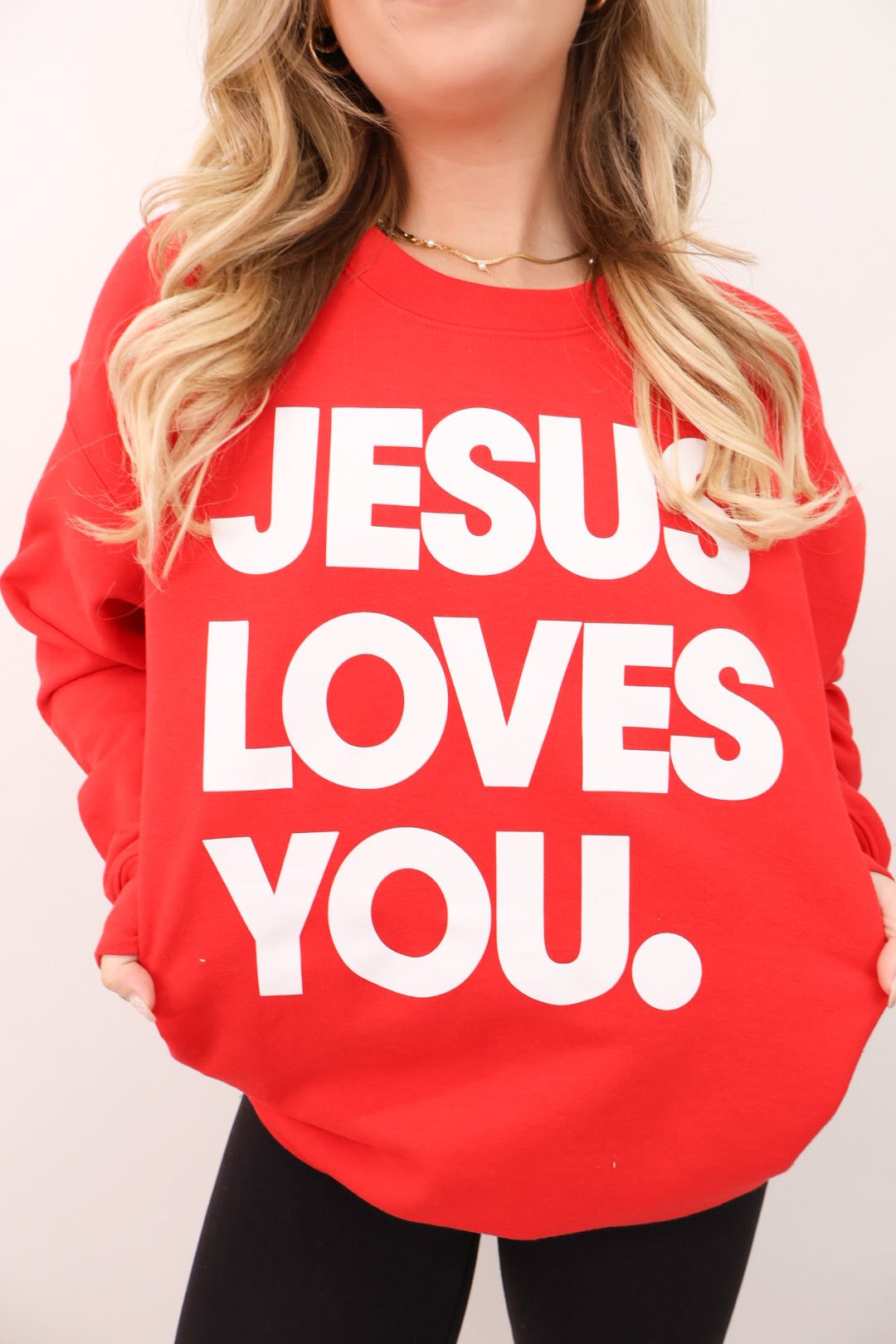 Christian graphic sweatshirt, Jesus Loves You sweater, faith-based apparel boutique, inspirational sweatshirt women, cozy holiday graphics, Christian clothing boutique, Moda Boutique faith collection