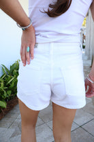 white denim shorts, women’s high rise shorts, boutique white shorts, summer staple shorts, classic white jean shorts, vacation outfit women, spring break bottoms, everyday summer denim