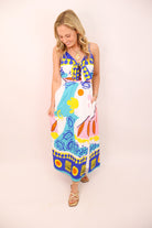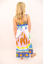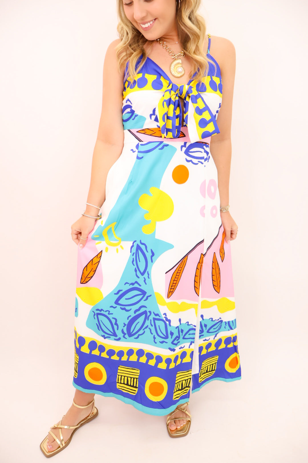This vibrant tie-front dress is a perfect addition to your suitcase! Featuring bold and playful tropical patterns in bright blues, pinks, oranges, and yellows, this dress exudes a fun, carefree style ideal for your next vacation or beach getaway. The flattering V-neckline and adjustable tie-front detail create a feminine silhouette, while the adjustable straps offer a customizable fit. The dress is completed with a flirty side slit, allowing for a touch of leg and added movement. Crafted from a lightweight fabric, it’s perfect for warm weather and sunny days, making it your go-to for lounging by the pool or enjoying an evening out.