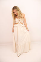 cream cutout maxi dress, halter summer dress, southern chic dress, ruffle linen dress, wedding guest maxi dress, country concert outfit