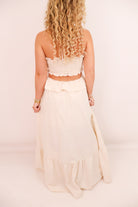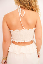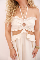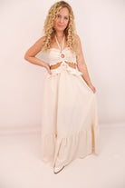 Soft, flirty, and effortlessly stunning—this cream halter dress was made for golden hour. The ruched bust features a flouncy ruffle trim with a central ring cutout, while the waist cutout leads into a relaxed-flowing maxi skirt that moves beautifully with every step. From the smocked back panel for stretch to the halter neckline for support, this one combines comfort with total wow-factor. Perfect for summer events, dinner on vacation, or dressing up for your next country concert.