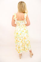 Embrace effortless beauty in our Yellow Floral Smocked Maxi Dress, a sunshine-filled staple for spring and summer. Designed with a smocked bust for a flattering, flexible fit, this dress features delicate flutter sleeves that add a soft, feminine touch. The tiered maxi skirt flows beautifully, creating movement and elegance with every step. Whether you're attending a baby shower, bridal event, wedding, or enjoying a sunny vacation, this dress is the perfect blend of comfort and charm.