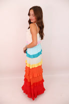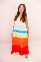 rainbow tiered maxi dress, summer vacation dress, colorful ruffle dress, resort wear maxi, lightweight beach dress, adjustable strap maxi dress, tropical destination outfit, bold summer dress, vacation-ready maxi, The Destination Edit