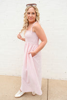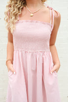 Timeless, charming, and made for summer sunshine—the Harbor Stripe Smocked Midi Dress is giving us classic Americana with a playful twist. This dress features a stretchy smocked bodice for a flattering and comfortable fit, with a red and white pinstripe pattern that feels crisp and coastal. The adjustable tie straps add a sweet touch and allow you to customize the fit, while the gathered skirt flows effortlessly to midi length.