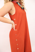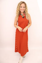 A stunner for the season! This rust ribbed maxi dress is made from a soft textured knit in a rich rust hue that’s perfect for fall. The sleeveless silhouette is simple and clean, but it’s all in the details — gold metal stud details down each side, a flattering straight fit, and a back center slit creating ease of movement. From brunch to church to fall photoshoots, it’s giving elegance with comfort.