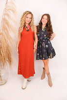 rust maxi dress, fall knit dress, sleeveless gold detail dress, boutique fall outfit, fall transition dress, rust colored dress, casual rust midi dress, fall family photos dress