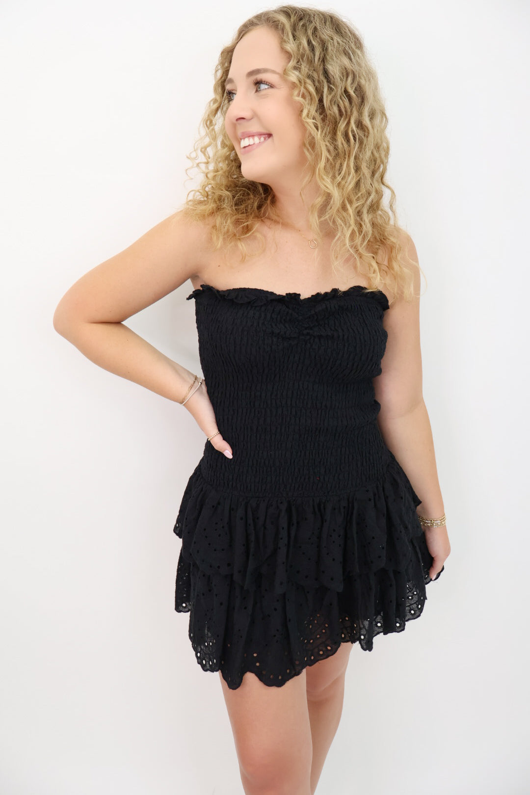 Get ready to cheer on your team in style with our strapless smocked dress! This smocked mini dress features a charming eyelet tiered flounce hem that adds a touch of femininity. Perfect for gameday, this dress will keep you cool and comfortable while you show off your team spirit. Go team!