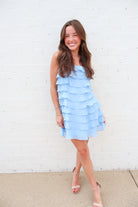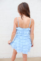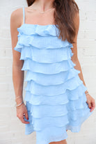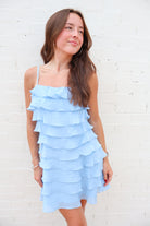 ruffle mini dress, blue ruffle dress, summer party dress, girly tiered dress, sorority rush dress, baby blue dress for events, flirty ruffle dress