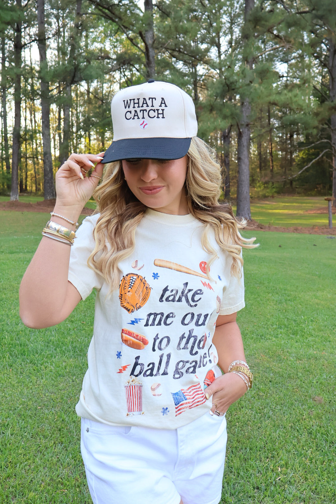 This one is equal parts cute and cheeky—the What A Catch Trucker Hat is the perfect finishing touch for any gameday look. The neutral front with bold black lettering keeps it classic, while the little baseball detail adds just enough personality.