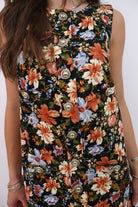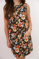 Bring on the retro charm with this black floral button-front dress — a perfect mix of vintage vibes and modern ease! The sleeveless cut makes it ideal for layering with a turtleneck or wearing solo on warm fall days, while the bold floral print pops with rich shades of rust, cream, and dusty blue. Functional pockets and statement gold buttons add the perfect finishing touches. Whether you’re headed to brunch, the office, or strolling downtown, this dress is a timeless pick that works season after season.