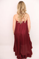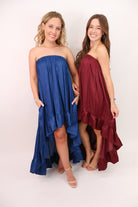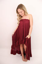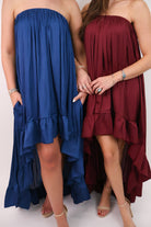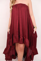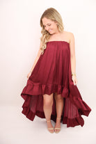 Satin Strapless High-Low Maxi Dress - Burgundy