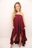 Say hello to your new statement piece. This satin strapless maxi dress is effortlessly chic with its flowy silhouette, ruffled high-low hem, and subtle sheen that catches the light just right. Designed with a generous flowy fit and side pockets (yes, pockets!), it’s the kind of dress you can throw on and instantly feel put-together—whether you’re headed to dinner, a wedding, or vacation nights out!