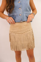 Bring the drama with our Studded Fringe Suede Skirt — a playful, flirty piece that moves with you. Made from a luxe faux suede, this mini features two tiers of fringe with subtle studded accents for a western-meets-boho vibe. Perfect for concerts, fall festivals, or just making a statement, it’s a skirt you’ll reach for when you want all eyes on you!