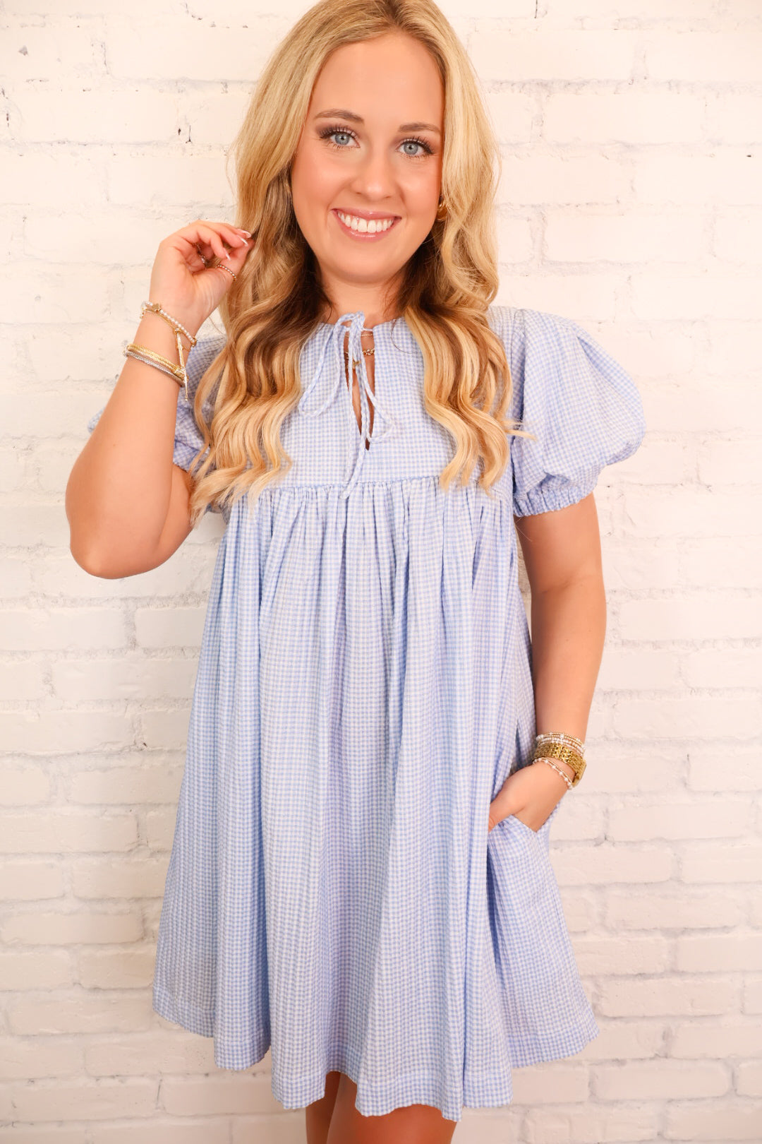 gingham babydoll dress, blue gingham mini dress, spring gingham dress, brunch dress inspo, easy spring dress, wedding guest dress, church dress, blue gingham Easter dress, blue dress for baby shower