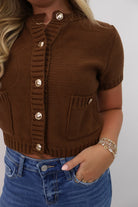 A little cardigan, a lot of style — the Gold Button Front Knit Cardigan Top is a short-sleeve knit with statement buttons and patch pockets for a touch of vintage charm. Wear it buttoned up as a top or open over a tank for layering ease.