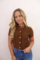 short sleeve cardigan top, cropped knit cardigan, chocolate knit button top, black short sleeve cardigan sweater